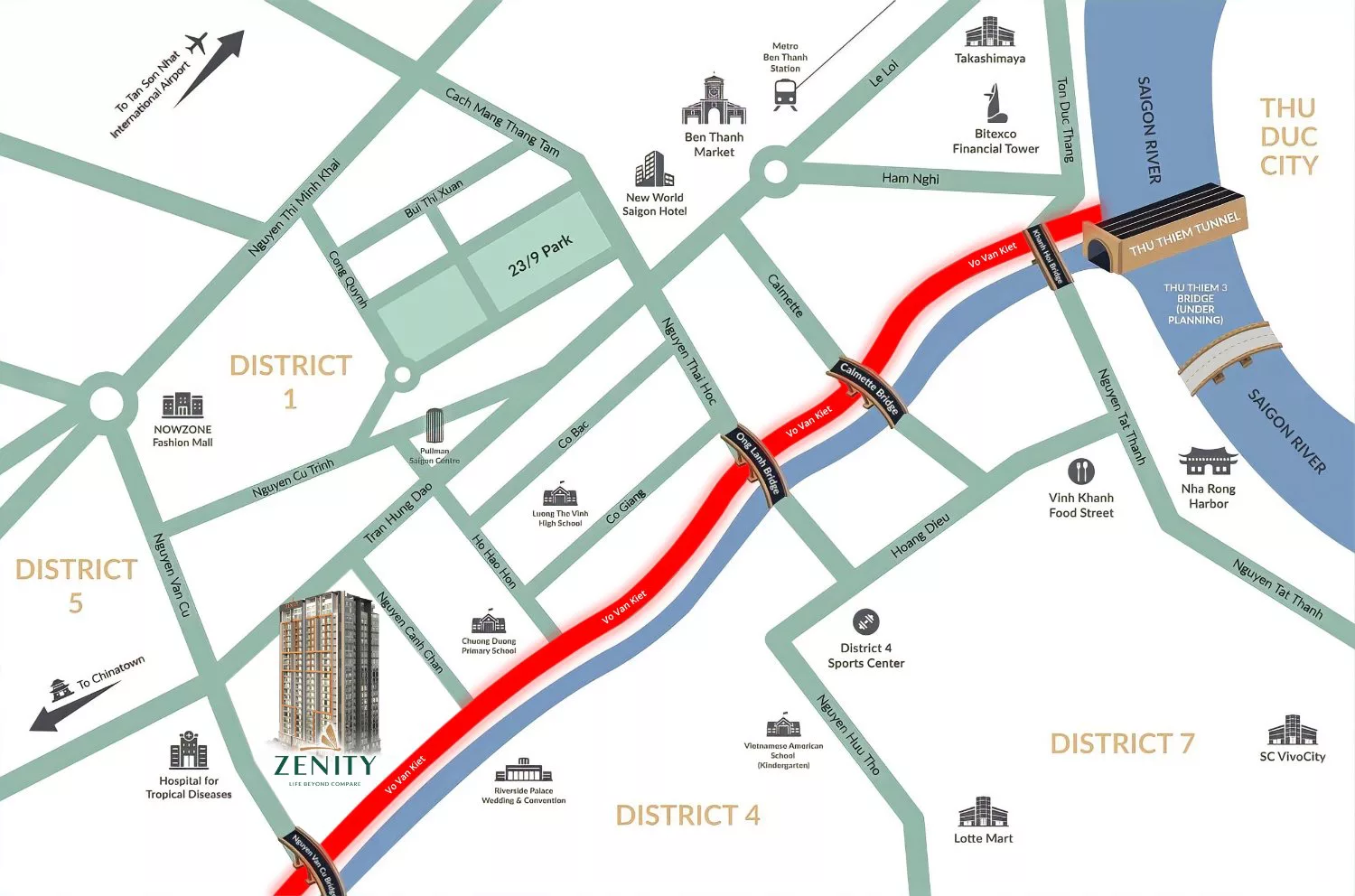 Toạ lạc tại số 608 Võ Văn Kiệt, phường Cầu Kho, Quận 1, dự án Zenity chỉ cách chợ Bến Thành và khu đô thị Thủ Thiêm khoảng 8 phút di chuyển; cách sân bay Tân Sơn Nhất khoảng 30 phút di chuyển, cách khu đô thị Phú Mỹ Hưng và Landmark 81 khoảng 15 phút.